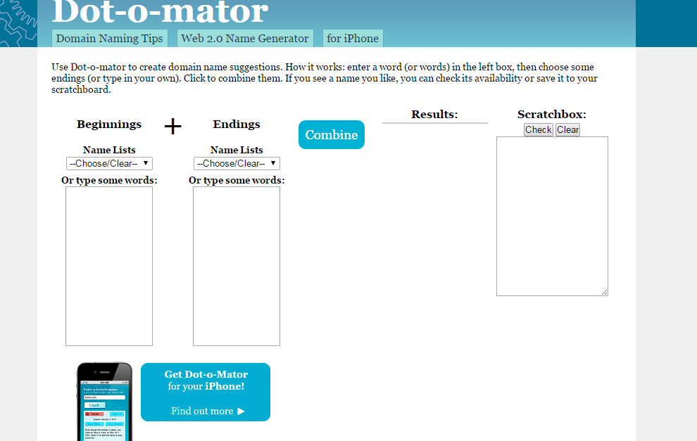 It is a great online tool that helps people to create the perfect names for their companies. Besides the regular word input box, Dot-o-Mator also offers an ending box, where the users can choose from the list some preferred endings for their company names or can add their own endings. If you see a name that you like, but you want to continue your search, you can add and save it to you scratchboard and access it later.