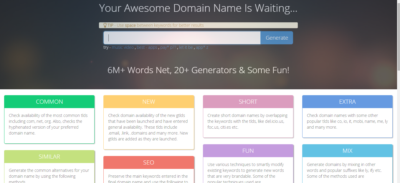 Choose the domain for your website by using Name Mesh – a great online tool that allows the user to define their preferences by search in different categories as Common, New, Short, Extra, Similar, SEO, Fun and Mix. Your awesome domain name is waiting for you to discover it with Name Mesh.