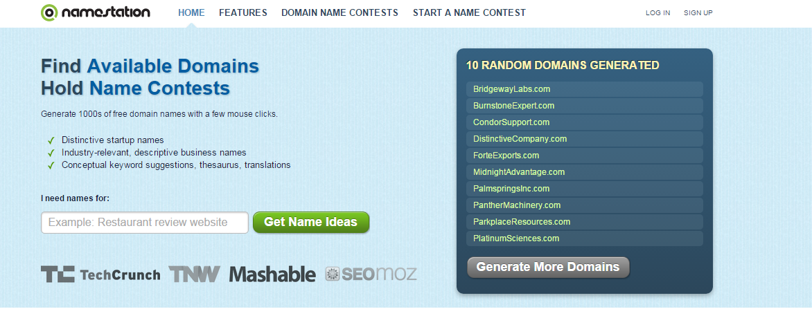 If you are in search for distinctive, industry-relevant and descriptive business names, this tool is the right for you. It is a domain name generating tool that creates relevant name ideas from the chosen criteria and category. NameStation also will show you a list with suggested available domains that you can use for the website of your company.