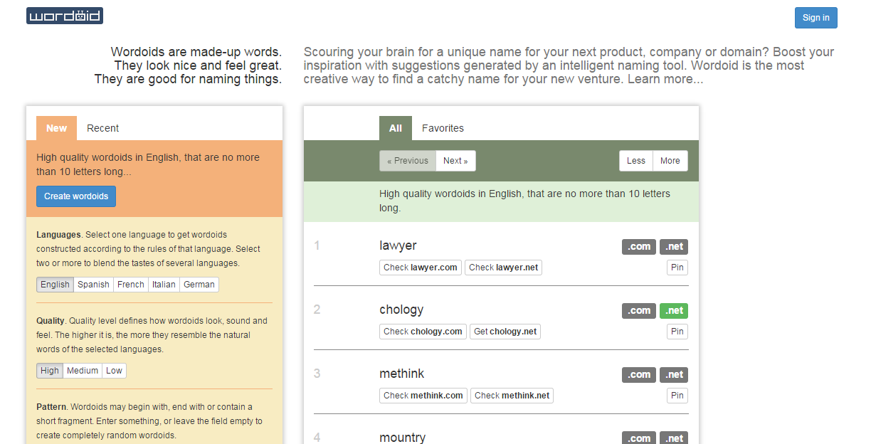 All startups are unique and need to have unique, catchy and creative names as well. So, here is Wordoid which is an online tool for made up words that look nice and sound great. You can choose the language, the quality level, even the pattern for your search – it is all so easy and fun.