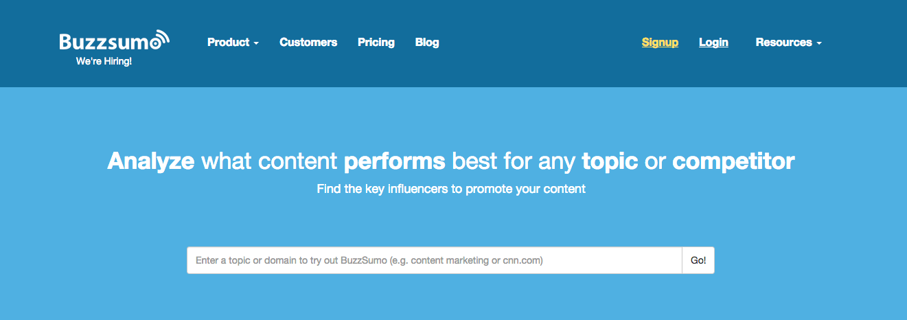 BuzzSumo is great tool that helps entrepreneurs create successful SEO campaigns by allowing them to search the most popular topics and help them find trending ideas for their campaign. BuzzSumo helps you to analyze what content performs best for any topic or competitor and also helps you to find the key influencers to promote your content.