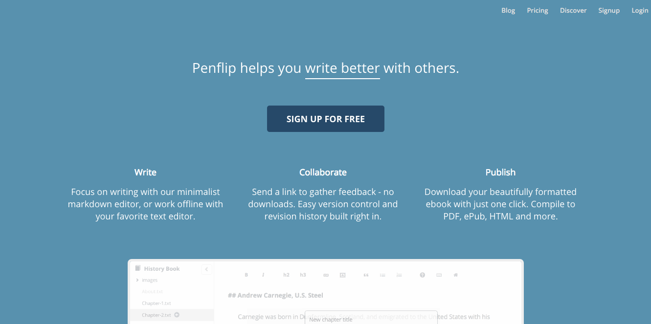 Penflip is a writing tool, which helps you to write with other people by collaborating with them. You are able to share your text with anyone, to accept or reject changes, to share ideas by using the discussion boards, to get feedback from other Penflip writers, and discover projects from the community. From writing blog posts to Ebooks: Penflip is the tool that will help you achieve great results with your content.